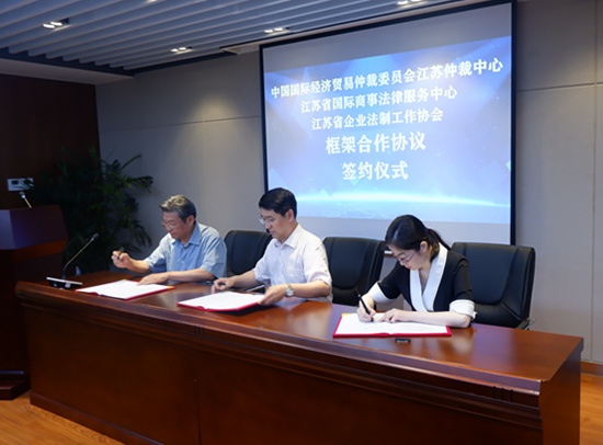 2021年6月18日,贸仲江苏中心与江苏省企业法制工作协会(以下简称“”企业法制协会”)、江苏省国际商事法律服务中心(以下简称“商法中心”)在南京签署三方《框架合作协议》。合作协议签署仪式由贸仲江苏中心副秘书长汤寅宏主持,贸仲仲裁院副院长兼江苏中心秘书长谷岩、企业法制协会会长陈为保和商法中心主任薛新岚代表三方在合作协议上签字。