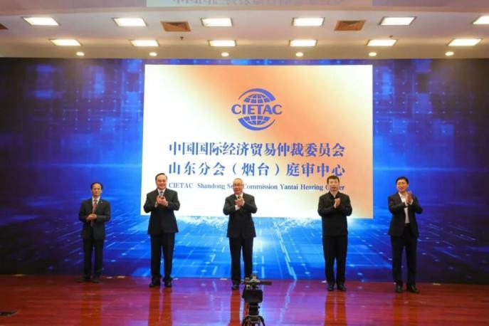 [与会嘉宾共同启动贸仲山东分会(烟台)庭审中心]