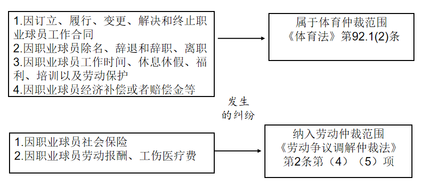 (1)因确认身份而引起纠纷,依照请求内容不同,分别纳入劳动仲裁、体育仲裁范围