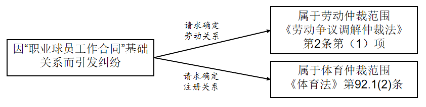 职业球员是俱乐部劳动者,但是从事特殊劳动劳动者,因此职业球员不仅具有劳动者身份,也是球员的特殊劳动者身份。因此,依据球员诉请的内容,来判断管辖:如请求确认劳动者身份,即劳动关系确认(劳动争议调解仲裁法第二条第(1)项“因确认劳动关系发生的争议”),属于劳动仲裁范围;如请求确认球员身份(特殊劳动者),即要求明确球员的注册身份问题(体育法第九十二条第1款第(2)项“因运动员注册、交流发生的纠纷”),则属于体育仲裁范围,如下图。