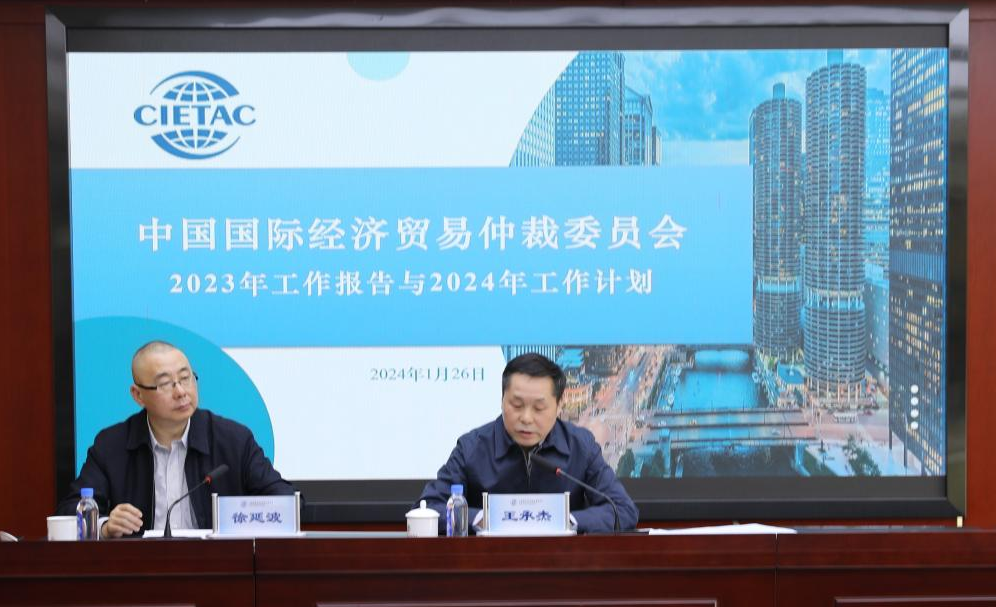 2024年1月26日下午,贸仲委2023年度干部职工总结大会在北京召开,贸仲委全体领导班子成员、总分会干部职工出席会议。会议全面回顾2023年工作成果,深刻分析当前形势,谋划部署2024年工作任务。贸仲委副主任兼秘书长王承杰作2023年工作总结,贸仲委党委书记徐延波主持会议。