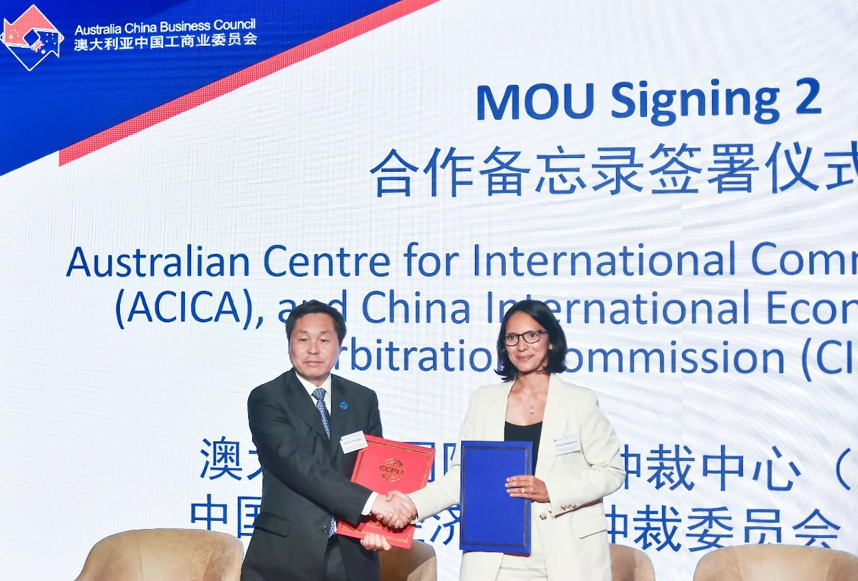 2024年4月15日,在中国贸促会会长任鸿斌率中国企业家代表团访问澳大利亚期间,由中国贸促会和澳中工商业委员会共同主办的中国-澳大利亚商务研讨会在澳大利亚悉尼举行。中国国际经济贸易仲裁委员会(以下简称“贸仲”)副主任兼秘书长王承杰与澳大利亚国际商事仲裁中心主席乔治娅·奎克(Georgia Quick)在悉尼签订了合作协议。