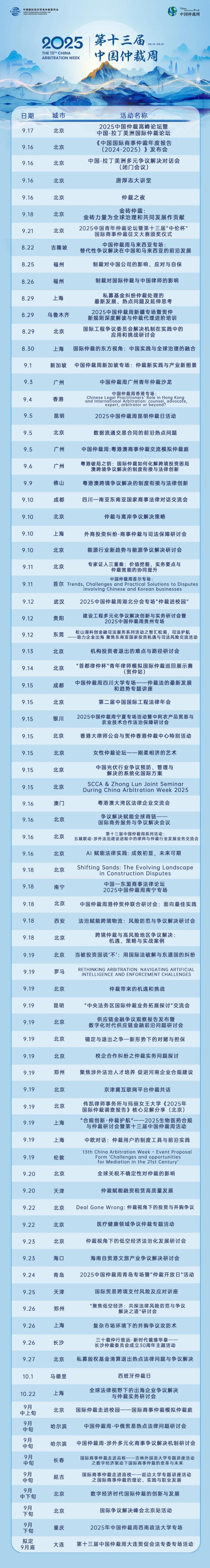 2025年9月,一年一度的中国仲裁周即将如约而来。十三载春秋砥砺,笃定前行,中国仲裁周积极搭建全球仲裁法治交流与合作桥梁,不断探寻国际商事仲裁发展前沿,平台规模逐步扩大,专业价值与全球影响力日益攀升。目前,2025年中国仲裁周多项专场活动正在加紧筹备,我们期待能与更多新朋老友并肩同行,拥抱数智,共启未来。