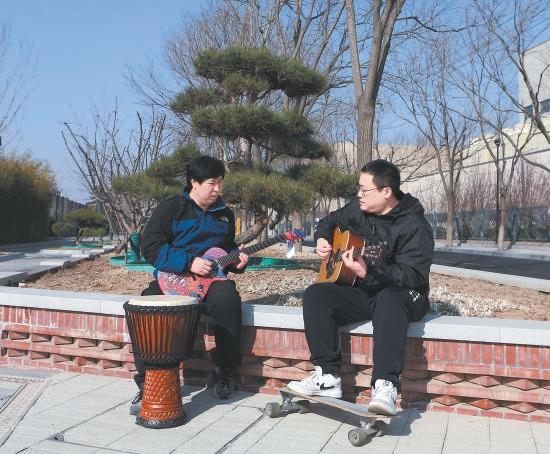 两位音乐爱好者在台湖舞美艺术中心口袋公园内弹奏乐器。聂堂明摄