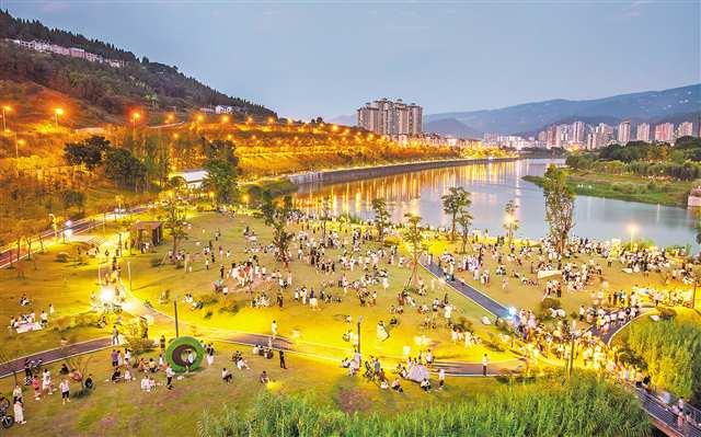 7月13日,夜幕降临,重庆市开州区滨湖公园夜色迷人,城市、湖水、草坪相映成趣,吸引众多市民前来休闲纳凉,乐享绿色健康生活。