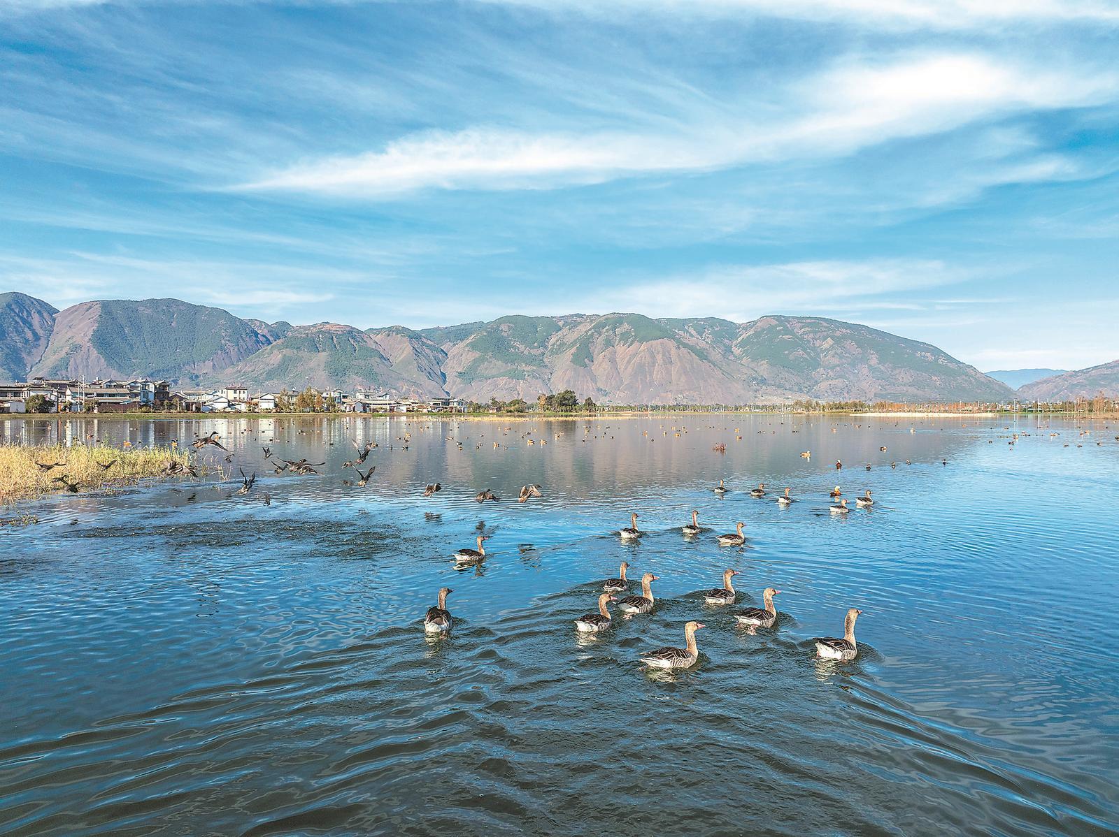 图为一群灰雁在云南省大理白族自治州洱源县茈碧湖湿地栖息、觅食。(资料图片)新华社发