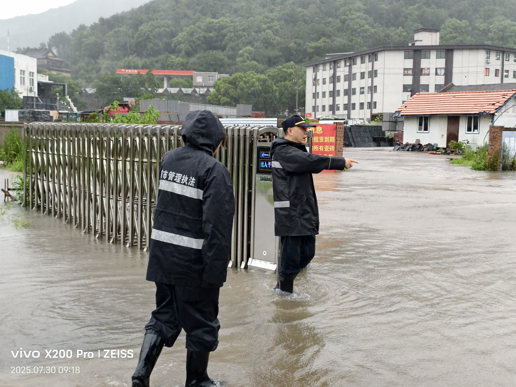 闻“风”而动,全方位启动应急响应。预警发布后,各地综合执法队立即进入应急备战状态,以“党员先锋岗”为引领,实行24小时应急值守。各地执法队对辖区内一级水库及易涝区域开展地毯式巡查,确保水利设施安全无虞;装填沙袋300余个,在低洼商铺门前构筑防水屏障,有效防止雨水倒灌;处置倒伏树木、遗失车牌等道路险情20起;加密对易涝点位的巡查频次,重点保障主次干道、商圈、菜场等人员密集区域道路畅通。
