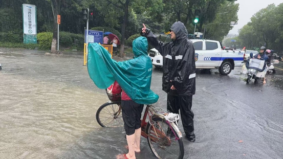 江北区综合行政执法局在台风登陆前,争分夺秒强化风险排查。执法人员方璐在老外滩街区巡查时,敏锐发现某酒吧将几摞未使用的瓦片堆放在屋顶,存在重大安全隐患。“你们赶紧找人把这些瓦片拿下来!”她立即与负责人沟通,明确告知违法风险,现场监督清理,及时消除了一处“头顶上的隐患”。同时,该局组织力量对户外广告、在建工地围挡、道路下穿等关键部位进行高频次巡查,提前在江安路、康桥南路下穿、通宁路、洪塘西路等易积水路段设置警示桩和警戒线。庄桥中队指导员江维海在积水中连续站立一小时,逆着风雨,一边搀扶市民安全通过,一边大声提醒过往车辆注意水深、谨慎慢行,嗓子喊哑了也顾不上休息。