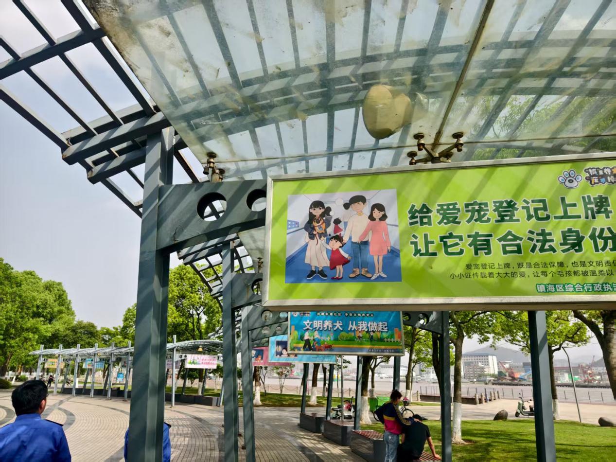 招宝山街道沿江公园的步道边,是今年新增设的文明养犬宣传长廊,金属展板上用简单的漫画和标语提醒市民们文明养犬的注意事项。旁边的宠物便袋箱里面装着一卷卷可降解清理袋,供遛狗的居民随时取用。