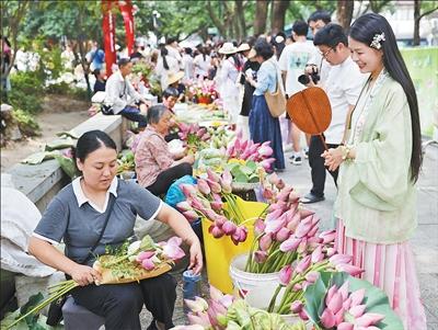 市集里,不少摊主是本地农户。每天清晨,年过七旬的沈秋云都会挑着自家种的荷花前来售卖;摊主张小兰自称“花老板”,在自家摊位前笑迎顾客……一个个普通农户在这里摆出小摊,售卖应季的鲜花和农产品,逐渐形成了颇有名气的“荷花市集”。