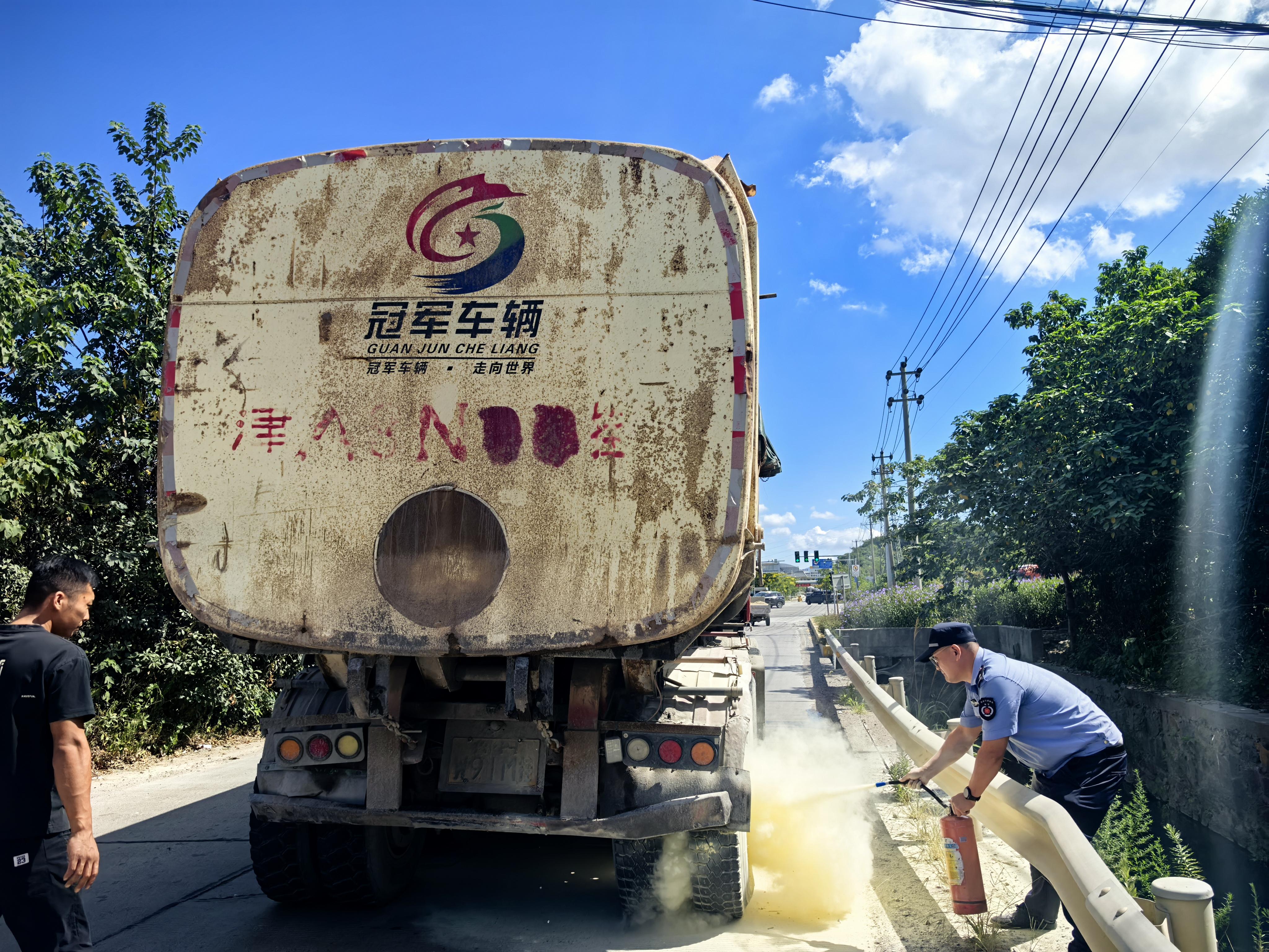 “快看,那车好像着火了!”8月27日9时30分许,戚家山综合行政执法中队执法人员张顺东正带队对一过路渣土车开展例行检查,渣土车司机王先生在等待检查期间发现路边一辆罐车车轮冒出浓烟,执法人员听闻后立即上前查看。此时,罐车的后轮轴承处已经起火。而罐车司机在队员们提醒下才发现起火。