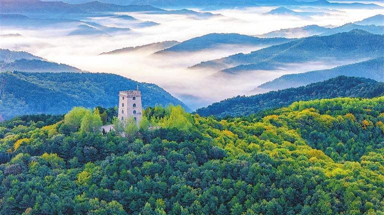 金秋时节,晨曦中的正宁县中湾林场调令关森林公园美如画卷。王启宁 摄