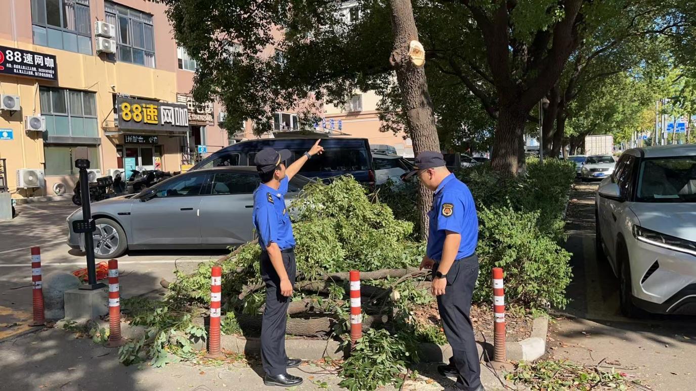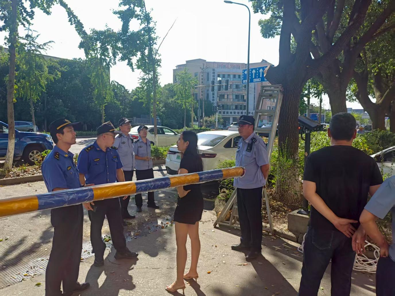 在处理过程中,执法人员并未简单“一罚了之”。考虑到酒店对树木遮挡问题的迫切需求,队员当即决定启动“马路办公”,将市政绿化部门工作人员、酒店负责人召集到现场,三方围坐展开协商。“直接砍树确实不对,但树枝挡着门牌,客人都找不到店,我们也着急。”酒店总经理任女士再次表达了难处。市政部门工作人员则现场勘查树木生长情况,提出解决方案:“这几棵香樟树是重要的行道绿化,完全砍伐很可惜,我们可以通过专业修剪,保留主干与健康枝条,既解决遮挡问题,又能维持绿化效果。”