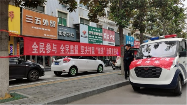 利用巡逻车、悬挂条幅开展多层次、多渠道、全方位宣传“双违”治理工作,加强正面宣传引导,形成强大舆论氛围。同时通过走街串巷面对面开展政策解读、法律宣传、风险提示等,把政策法规向群众讲清楚、讲明白,让“双违”治理工作入脑入心。