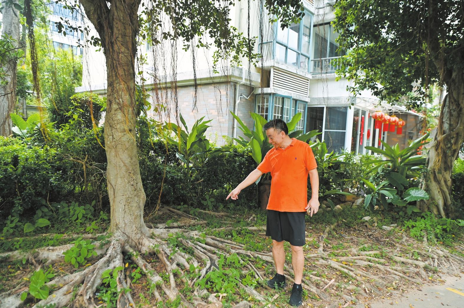 观澜公寓小区13A栋业主颜先生向记者讲述榕树根系带来的烦恼。记者 石中华 摄
