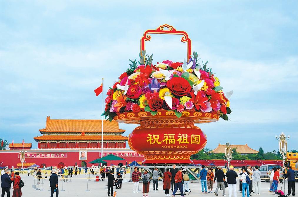 9月22日清晨,天安门广场中心“祝福祖国”花篮亮相。游客们驻足拍照,流连忘返。美丽的花篮还吸引了很多麻雀在花丛中穿梭嬉戏。 记者 王海欣 摄