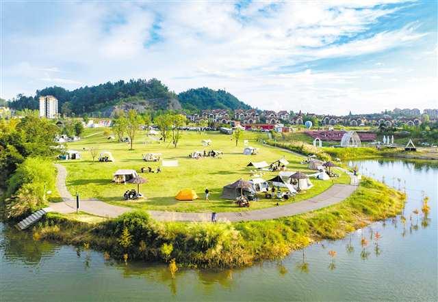 秋日的黎香湖镇湿地生态园,露营区大片的绿色草坪上,各式帐篷星罗棋布,游客们在此享受大自然的宁静与惬意。