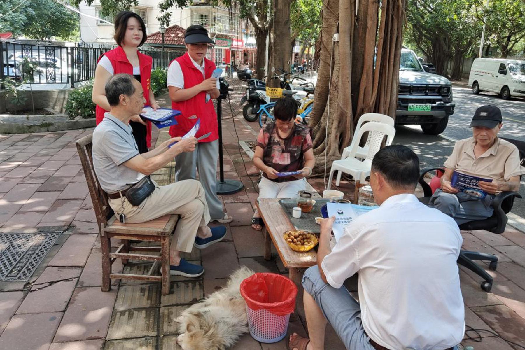 永兴县驻福州市流动党委工作人员正在福州市区发放禁毒防诈宣传资料。