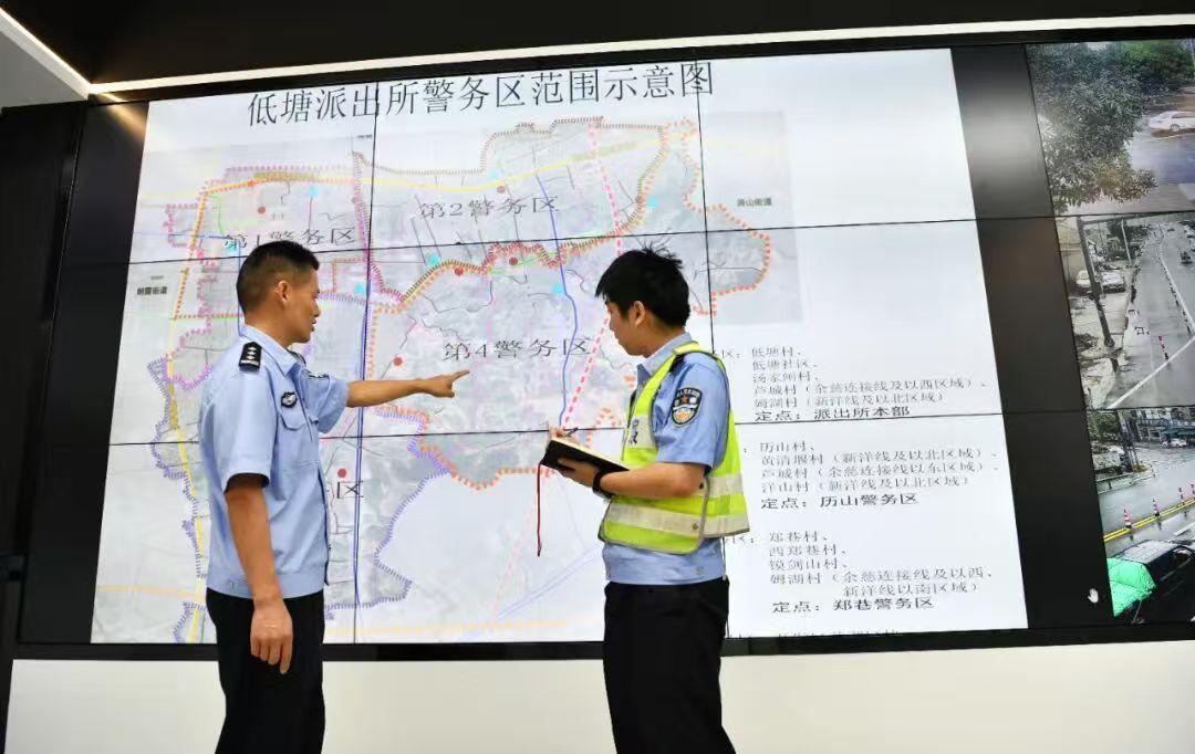 走进低塘派出所综合指挥室,科技感扑面而来。巨大的电子屏幕上,“指挥一张图”清晰显示着所有路面警力和巡逻车辆的实时位置。