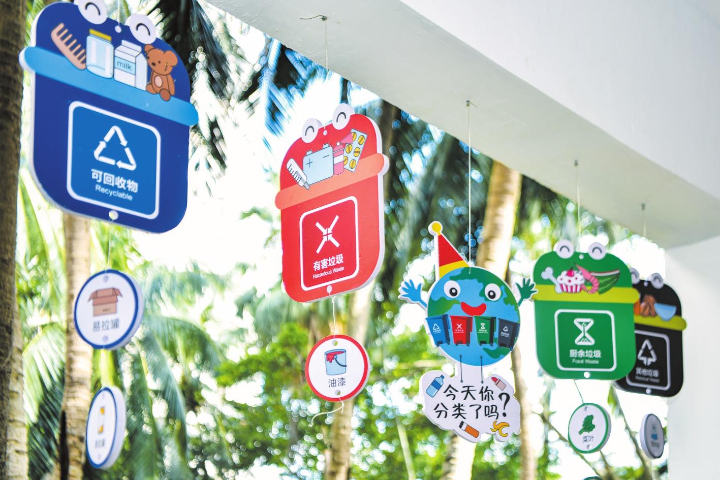 四季华庭小区在楼栋架空层打造垃圾分类宣教阵地,悬挂垃圾分类挂饰。记者 苏弼坤 摄