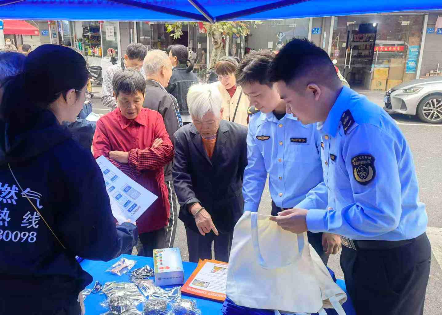 图为执法人员向居民发放宣传册