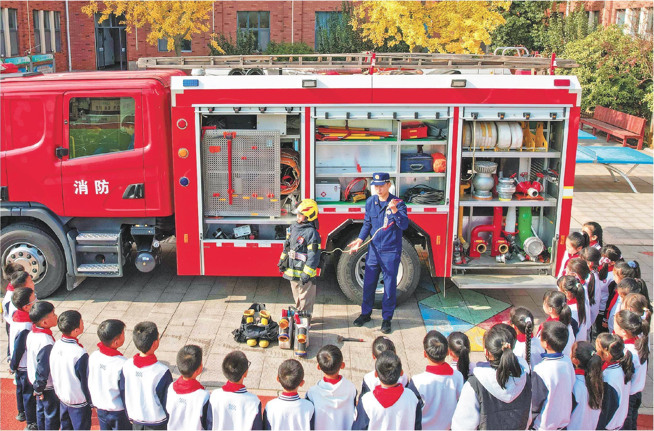 11月7日,消防救援人员为青岛升平路小学学生讲解消防装备知识。