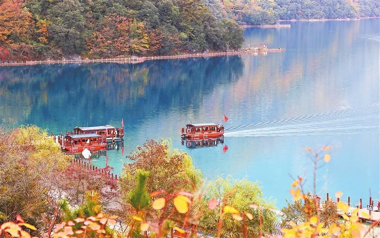 初冬时节,甘肃省陇南市文县天池国家森林公园层林尽染、碧波如镜,吸引游客前来赏景游玩。通讯员 后斌玉
