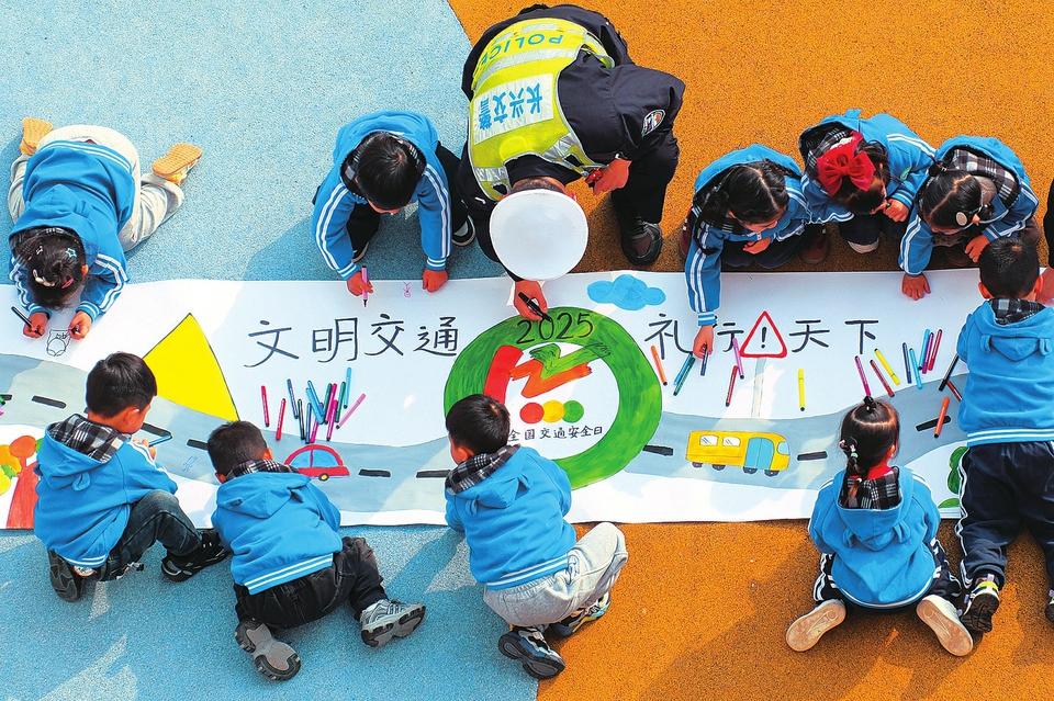 12月1日,浙江省湖州市长兴县水口乡中心幼儿园,长兴县公安局水口派出所交警中队工作人员与小朋友一起绘制交通安全主题画卷。在“全国交通安全日”来临之际,各地开展交通安全进校园活动,为同学们普及交通安全知识,培养交通安全意识。新华社发(谭云俸 摄)