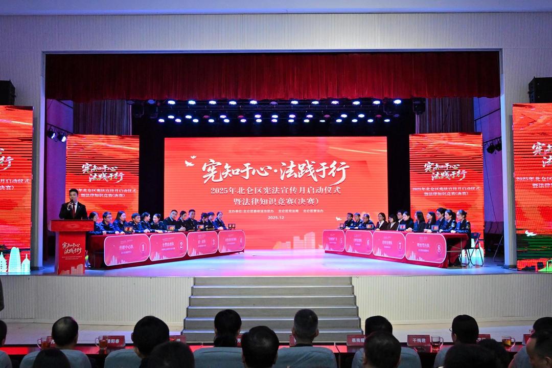 “3、2、1,开始抢答!”12月2日下午,位于宁波市北仑区的张人亚会堂内,随着主持人一声令下,抢答器提示音此起彼伏,现场气氛瞬间被推向高潮。这是2025年北仑区宪法宣传月活动启动暨“宪知于心・法践于行”法律知识竞赛决赛的现场。8支从初赛中脱颖而出的代表队在这里展开巅峰对决,也为该区丰富多彩的宪法宣传系列活动拉开了序幕。