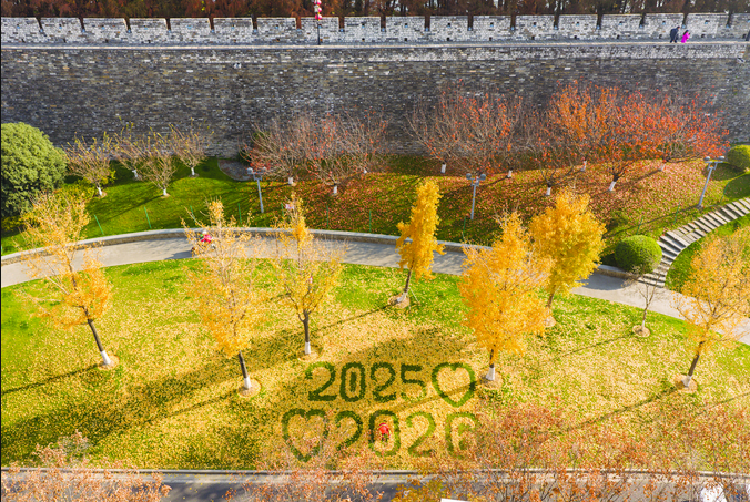12月6日,在南京市玄武区玄武门城墙边神武路,南京园林工人刘金顶用金灿灿的银杏叶摆出“2025爱2026”图案,引市民游客排队打卡。两组年份“2025”“2026”与两颗依偎的爱心,在古老墙根下组成一份跨越时光的温暖期许。(记者 闫春旭 通讯员 许韦国)