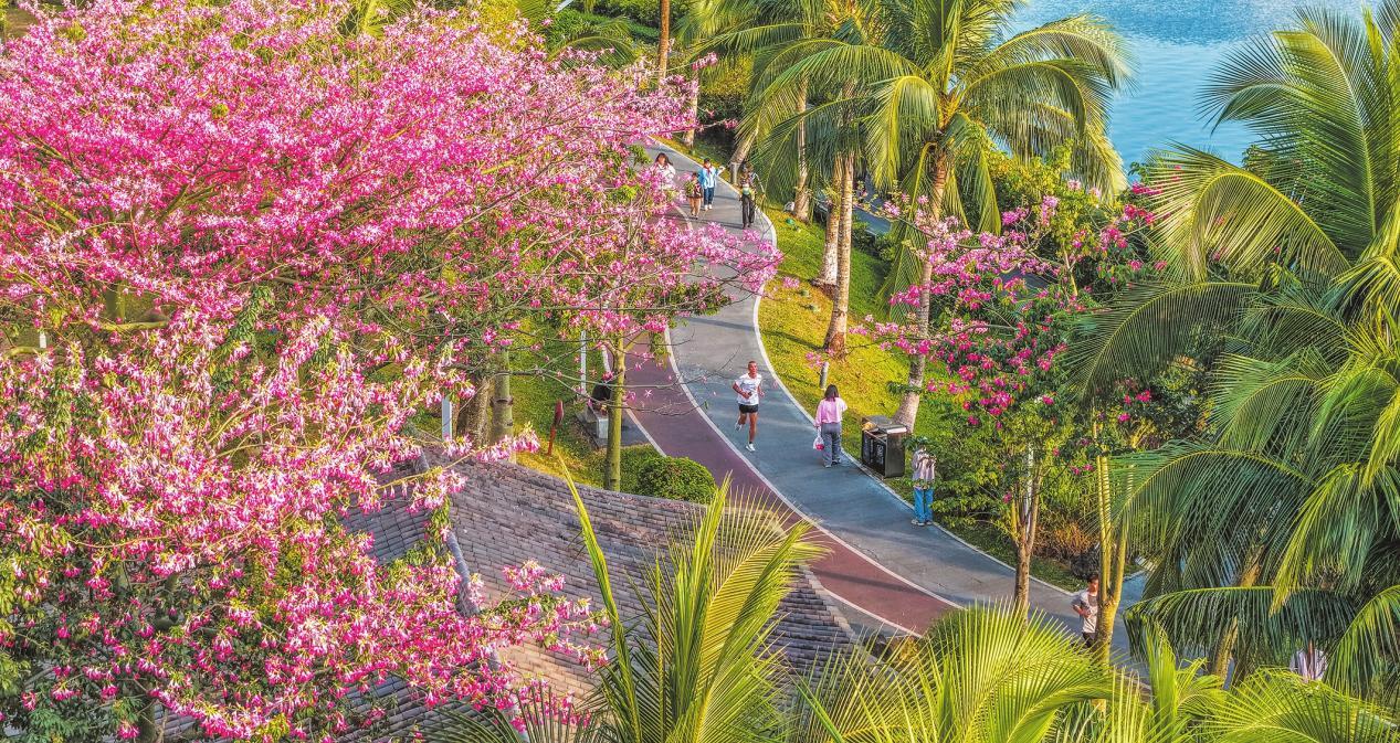 近日,海口红城湖公园的异木棉进入盛花期,满枝花色绚丽,与椰林、湖岸相映成趣,为冬日添了一笔暖色,也为步道增添了浪漫氛围。市民游客在其中或慢跑健身、或漫步赏花,一幅人与自然和谐相处的动人画卷在椰城铺开。(记者 康登淋 摄)