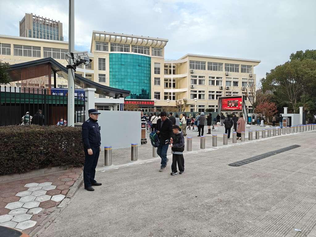 图为在丹城第五小学外执勤的执法人员
