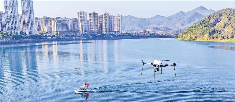 12月20日,位于福建省南平市顺昌县的富屯溪流域,工作人员正采取“无人机+摩托艇”的方式,开展富屯溪流域生态保护巡查。近年来,当地加强部门协同,利用科技赋能,精准摸排隐患,绘就智慧生态治理新图景。谢贵明 摄(中经视觉)