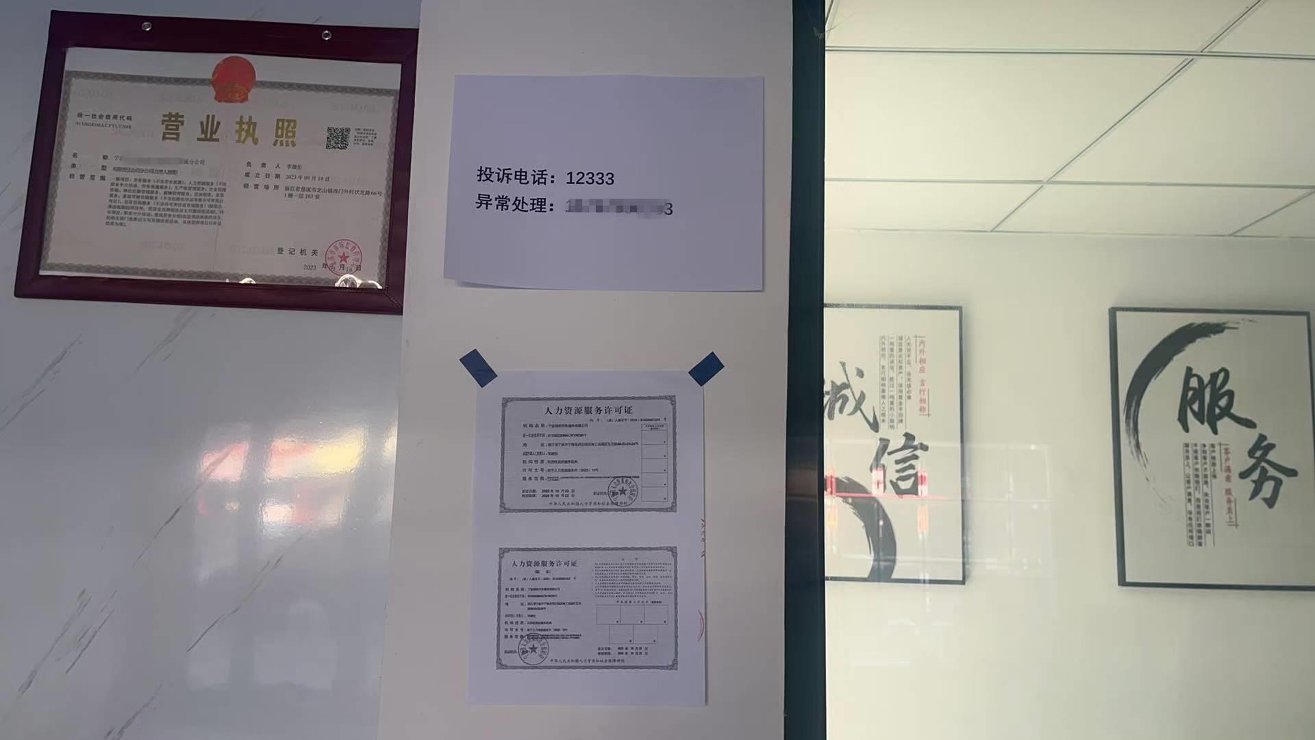 近日,在浙江省慈溪市龙山镇综合行政执法队职业中介行业的专项执法检查中,开设于龙山镇伏龙路上的某劳务服务公司因未明示人力资源服务许可证、监督电话、未建立服务台账等违规行为被行政处罚。这也是慈溪市对职业中介机构在信息公示、从业台账等规范化经营上开出的首张罚单。