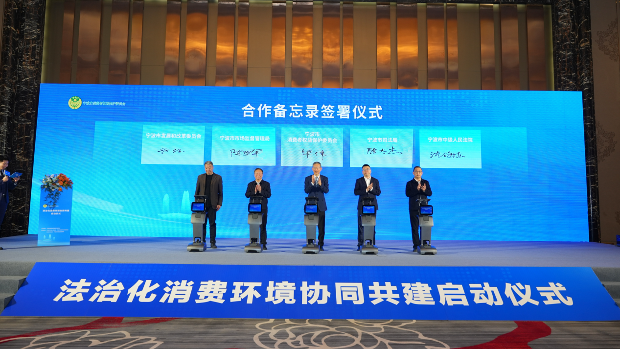仪式上,宁波市消保委、市中级人民法院、市发展和改革委员会、市司法局、市市场监督管理局五部门共同签署《关于构建法治化消费环境协同保护机制合作备忘录》,该协同机制正式建立。