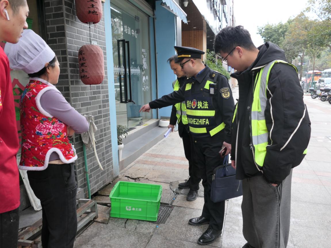 群众的急难愁盼就是执法的发力点。了解情况后,综合行政执法局立即启动协同治理机制,第一时间协调排水公司、属地街道执法队组成联合帮扶小组,直奔现场“把脉开方”。针对店铺的实际困境,帮扶小组敲定了一套简单易行的整改方案:在店门口原有自来水管的基础上,将排水管道从雨水井改接到街道污水井;同时在水龙头下方增设专用洗碗池,从源头实现污水的规范收集与排放。