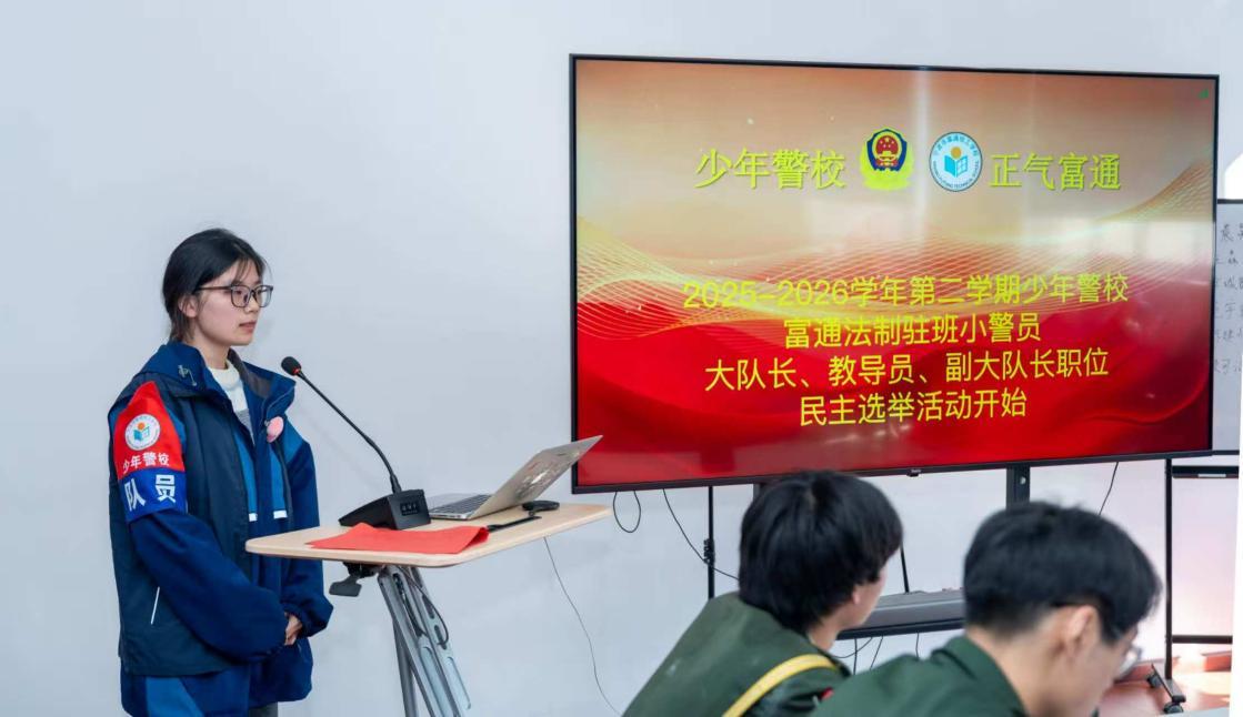 本次换届选举严格遵循民主、公正、公开原则,从12名主动报名参选的学生中,通过“驻班小警员”组织内民主投票的方式产生新一届组织领导集体。参选学生中,既有在组织中工作一年的骨干成员,也有刚进入高一阶段、充满朝气的新生力量。竞选现场,12名候选人依次登台,结合自身经历,交流参与“少年警校”各项活动和“小警员”组织日常工作的体会,阐述对组织建设和个人成长的理解与思考。在多位候选人的发言中,因临近高考于不久前卸任的首届“小警员”大队长许莹雪同学和副大队长马力同学被反复提及——两位同学在任期间,以务实的工作态度和稳定的组织能力,为驻班小警员组织的规范运行打下了坚实基础,也在小警员队伍中树立了鲜明的价值标杆。这种以实际行动传递责任意识和法治精神的示范效应,无疑是“少年警校”模式建设中尤为宝贵的育人成果。