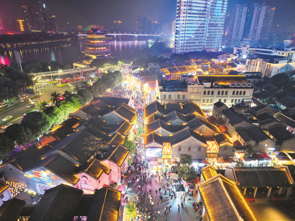 在邕州古城·三街两巷历史文化街区的青砖黛瓦间,文创市集与非遗工坊相互呼应;漓江书院内,游客在精心挑选国潮伴手礼;百年老店新华照相馆仍在为人们定格时光;传统小吃摊铺前聚集着络绎不绝的市民游客;“邕城印记”的老友粉制作、麽乜手工艺等互动项目吸引大量游客前来体验;国风主题节会、夜间巡游、街头演艺等演艺品牌丰富了文旅沉浸式消费体验,夜间经济点亮邕江之滨。该街区成功入选首批国家级夜间文化和旅游消费集聚区、首批国家级旅游休闲街区,越来越多的外地游客慕名到此,感受邕城文化的魅力。