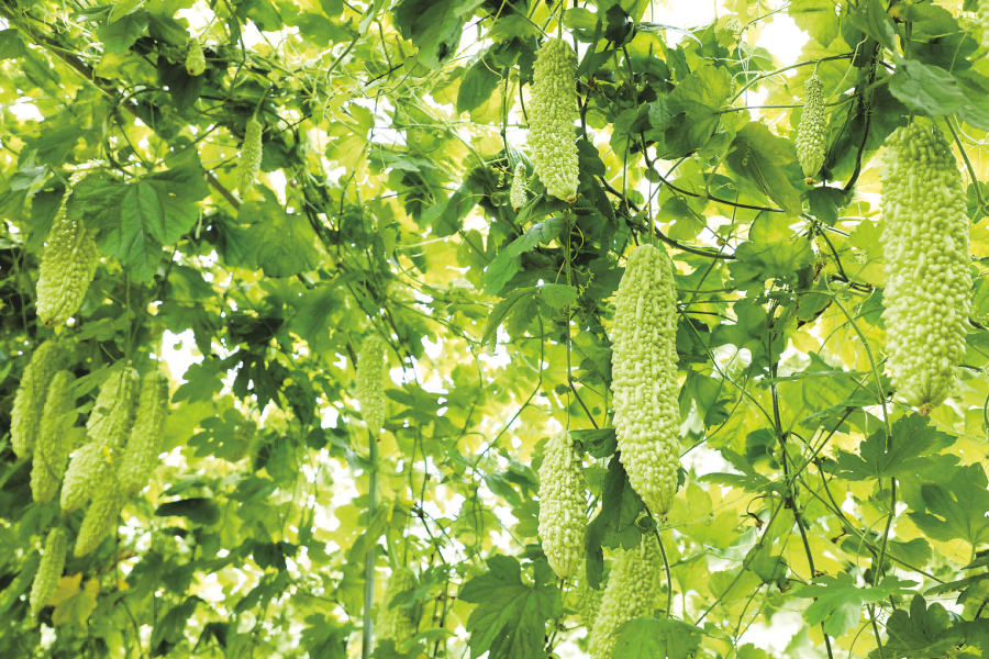 在兴宁区五塘镇,一根根颜色翠绿、个头饱满的“五塘苦瓜”挂满枝头。(侯呈志 摄)
