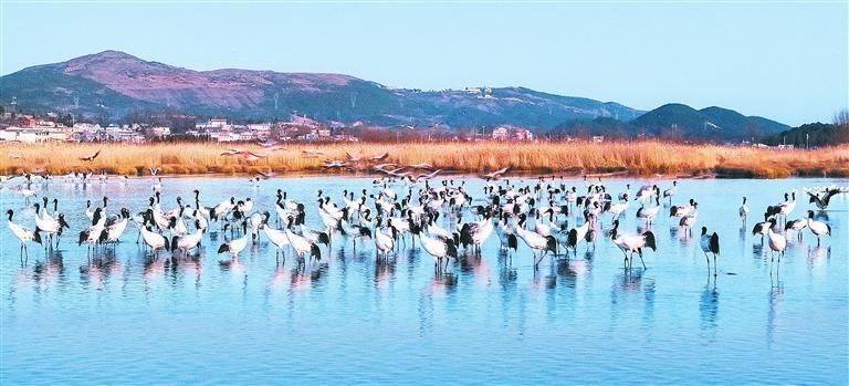 冬日,地处贵州省毕节市威宁县的草海国家级自然保护区呈现万鸟翔集的生态美景,黑颈鹤、灰鹤以及斑头雁等大批候鸟来此越冬。新华社记者 杨文斌