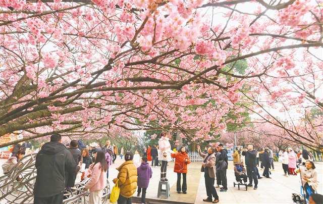 2月20日,重庆园博园,游客徜徉于樱花树下打卡拍照。特约摄影 钟志兵/视觉重庆