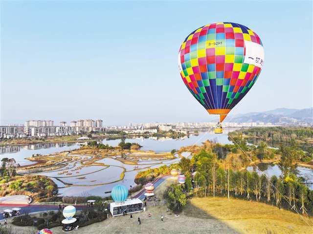 2月20日,梁平区双桂湖国家湿地公园,游客乘坐热气球俯瞰美景(无人机照片)。特约摄影 刘辉/视觉重庆