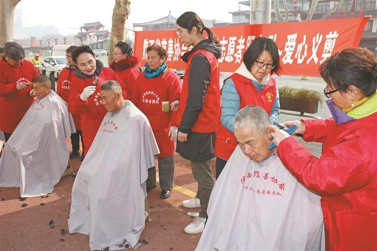 春节前,陕西省慈善协会爱心大姐志愿者服务队组织开展上门义剪服务。图为2月1日,爱心志愿者在西安大雁塔北广场为小寨东路环卫站全体环卫工人义务理发。吴宽宏 摄