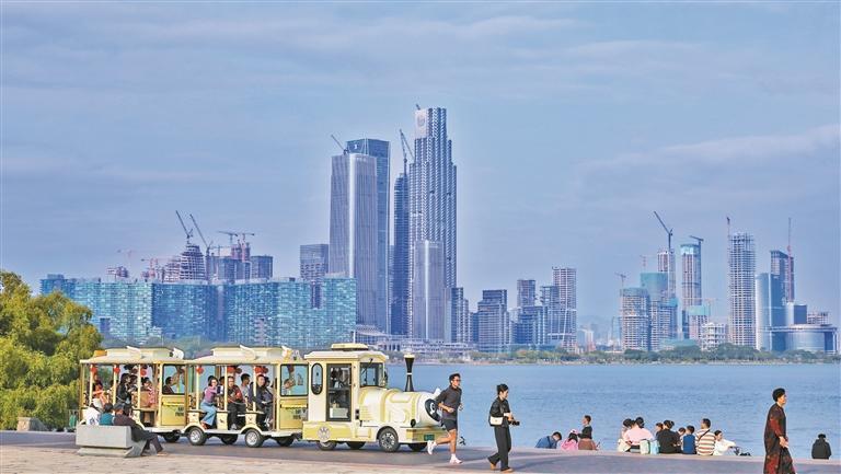 市民游客乘坐深圳湾公园观光小火车欣赏湾区美景。