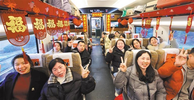 2月19日,务工旅客在G4840次务工定制高铁专列上合影。王超摄(中经视觉)