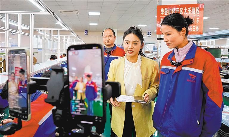 2月26日,四川省华蓥市组织网络主播走进企业生产车间,通过直播平台向网络求职者介绍企业情况。当地搭建企业和求职者岗位对接平台,实现“岗位找人”与“人找岗位”双向互动。周松林摄(中经视觉)