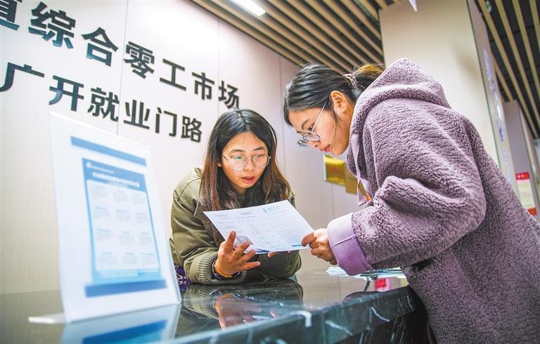 2月27日,浙江省湖州市德清县阜溪街道综合零工市场大厅,工作人员向求职者介绍灵活就业相关信息。王树成摄(中经视觉)