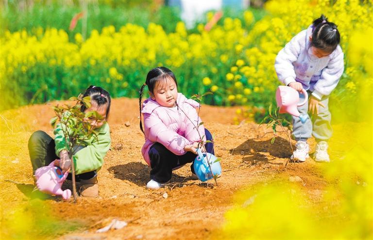 3月11日,江西省吉安市峡江县城西幼儿园劳动基地,小朋友在为新栽种的树苗浇水。陈福平摄(中经视觉)