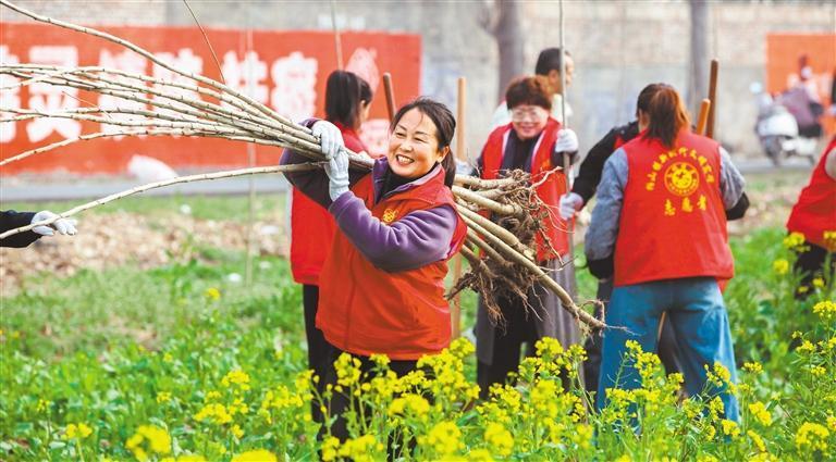 3月11日,河南省焦作市博爱县柏山镇大中里村,志愿者在搬运树苗,准备种植。程全摄(中经视觉)