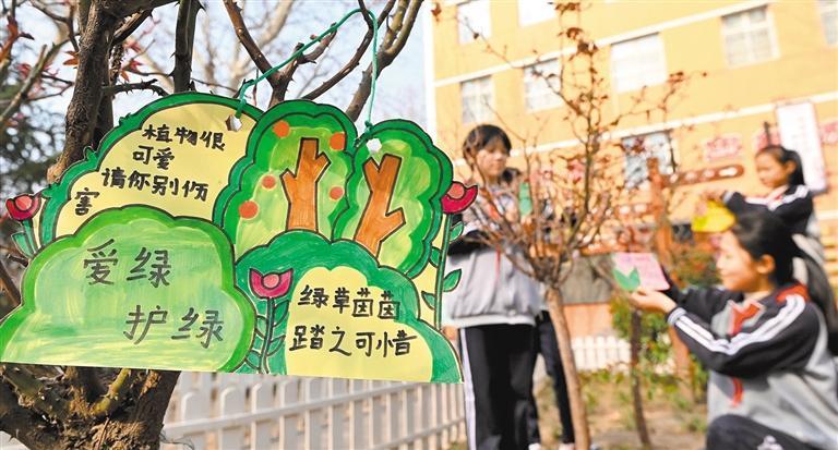 今年3月12日是我国第48个植树节。3月12日,河北省邯郸市复兴区铁路小学学生在小树上挂上心愿卡。郝群英摄(中经视觉)